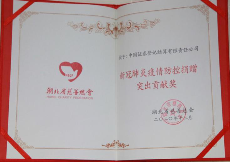 2020年2月,中國結(jié)算向湖北省慈善總會捐贈人民幣3000萬元用于支援湖北省新型肺炎疫情防控工作,其中1000萬元定向支援黃岡市三家定點(diǎn)醫(yī)院(黃岡市中心醫(yī)院400萬元、黃岡市中醫(yī)醫(yī)院300萬元、黃州區(qū)人民醫(yī)院300萬元)。